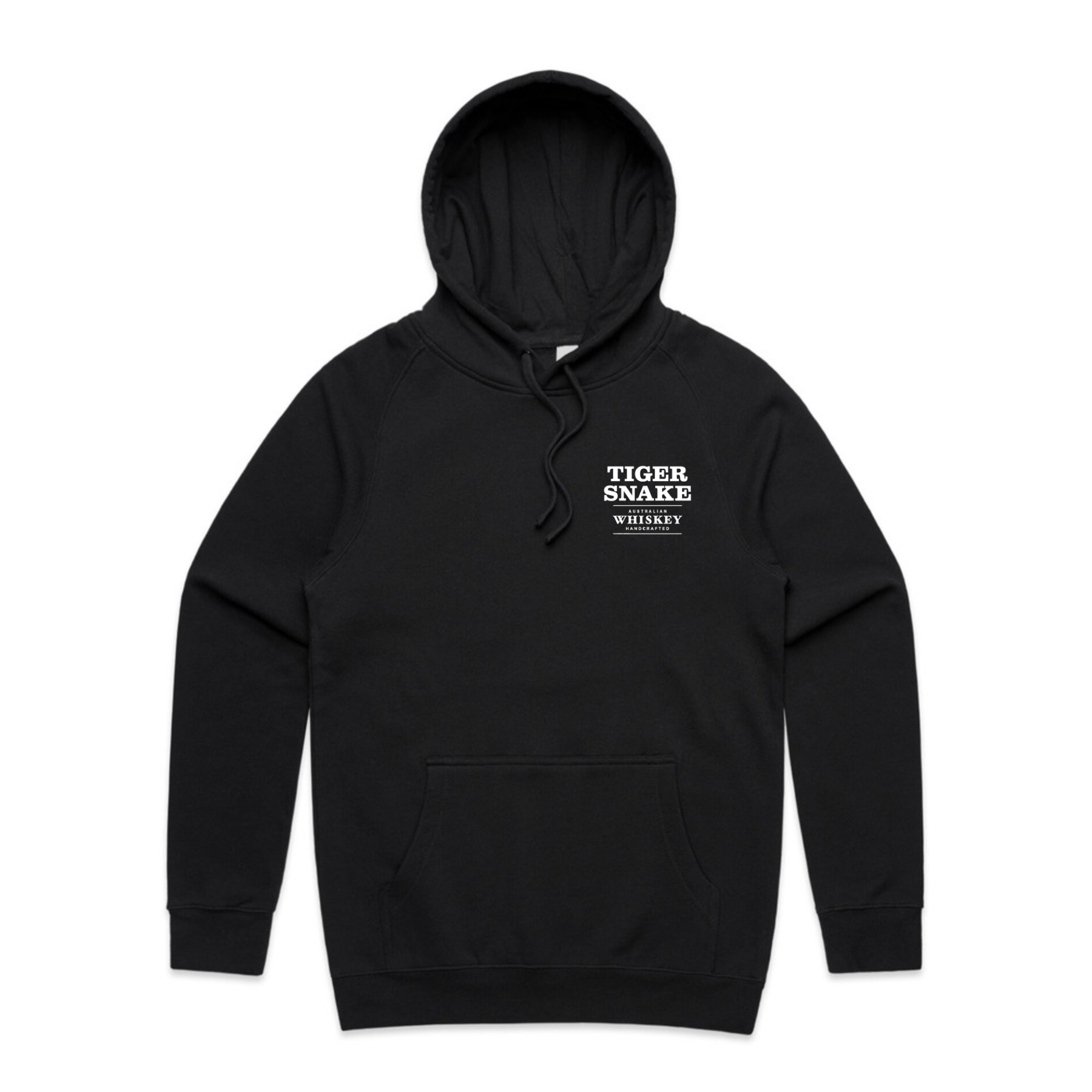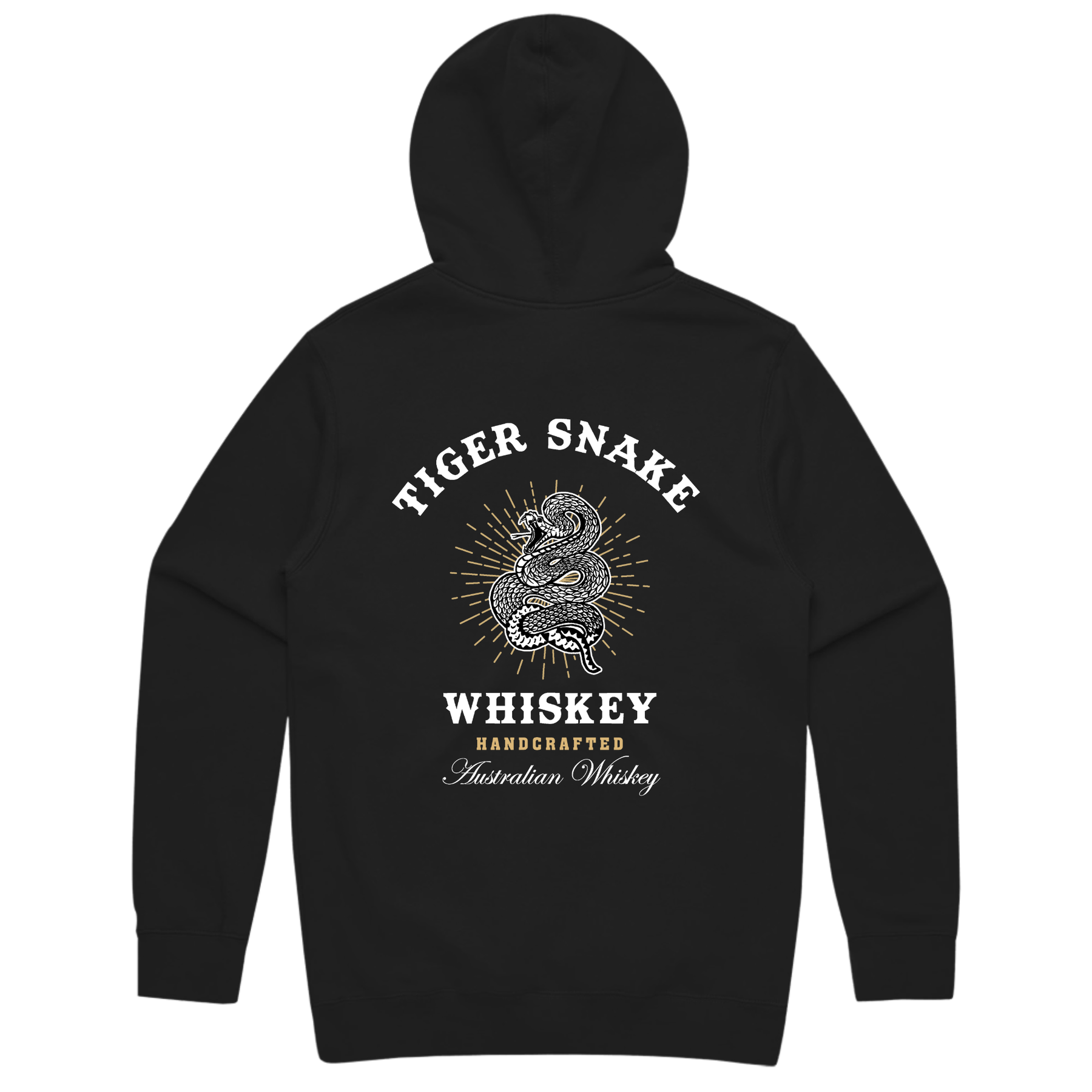 Relaxed unisex black hoodie featuring the Tiger Snake logo on both the front and back.